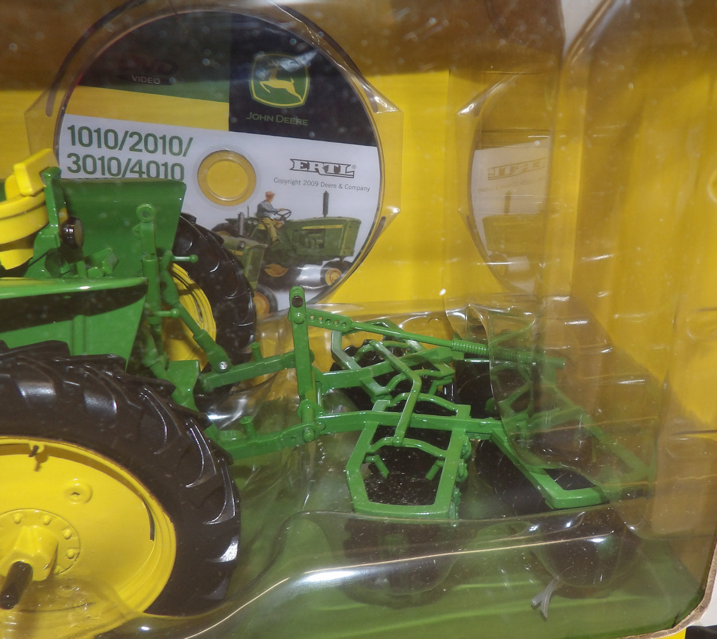 Stock #45159A - celebrating the 50th Anniversary of the 2010 tractor. 50th Anniversary Collector insert, die-cast metal with rubber tires, metal rims, steerable wide front axle, movable levers, authentic styled rear hitch with movable 3-point hitch. The KBL Disc is die-cast metal and plastic with rotating disk blades, attaches to the tractors hitch. Includes DVD with John Deere 1010/2010/3010/4010 historical promotional footage. Box is in new condition. Toy has not been removed from the box. Made in 2010 by Ertl, new in the box, 12" L x 4½" H x 4½" W, for ages 14 & up. Vintage, older out of production toy. AS IS.