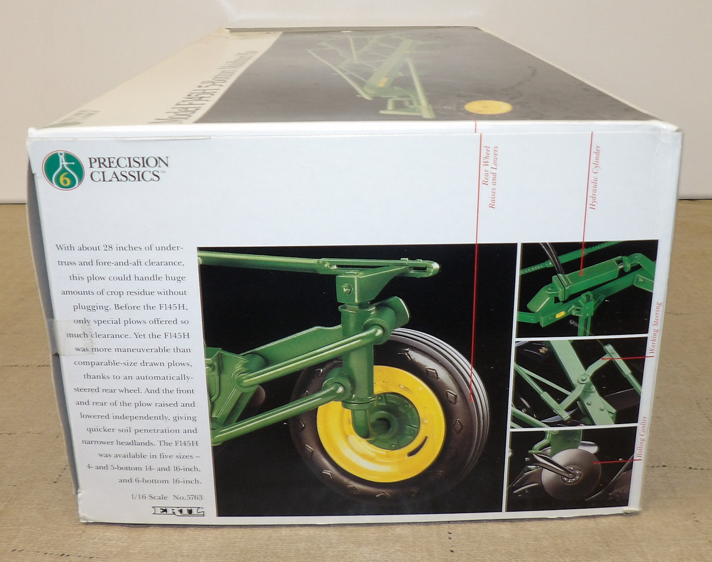 Stock #5763 - #6 in the John Deere Precision Classics series of high detail tractors & implements. Die-cast metal with rubber tires, realistic moving parts, rear wheel raises and lowers. Will hitch to the Precision JD 4020 & 4000 series tractors. Includes F145H 5-Bottom Plow Historical Booklet and Gold Collectors Medallion. Toy has been displayed out of the box, in very good condition. Box is in good condition with a some wear on the corners. Made in 1994 by Ertl, 12½" L x 2½" H x 4" W, for ages 14 & up. Item is out of a private collection. Vintage, older out of production toy. AS IS.