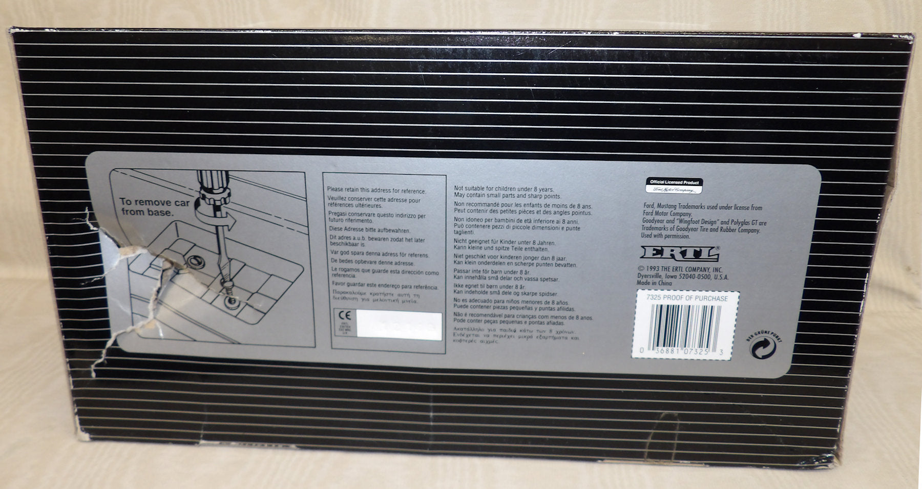 Stock #7325 - Grabber Blue with Black hood and body stripes. Die-cast metal with rubber tires, steerable front wheels, opening doors and hood, rear spoiler and sport slats. Car is in new condition, box is in fair condition with some minor wear on the edges and a tear hole on the bottom. Made in 1993 by Ertl, 9¾" L x 3" H, for ages 8 & up. Item is out of a private collection. Vintage, older out of production toy. AS IS.