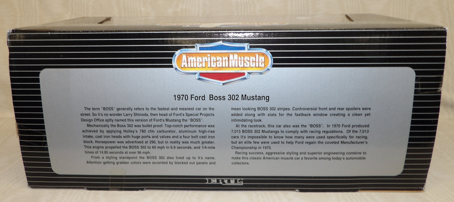 Stock #7326 - Grabber Yellow with Black hood and body stripes. Die-cast metal with rubber tires, steerable front wheels, opening doors and hood, rear spoiler and sport slats. Car is in new condition, box is in fair condition with some minor wear on the edges and a tear on the top. Made in 1993 by Ertl, 9¾" L x 3" H, for ages 8 & up. Item is out of a private collection. Vintage, older out of production toy. AS IS.