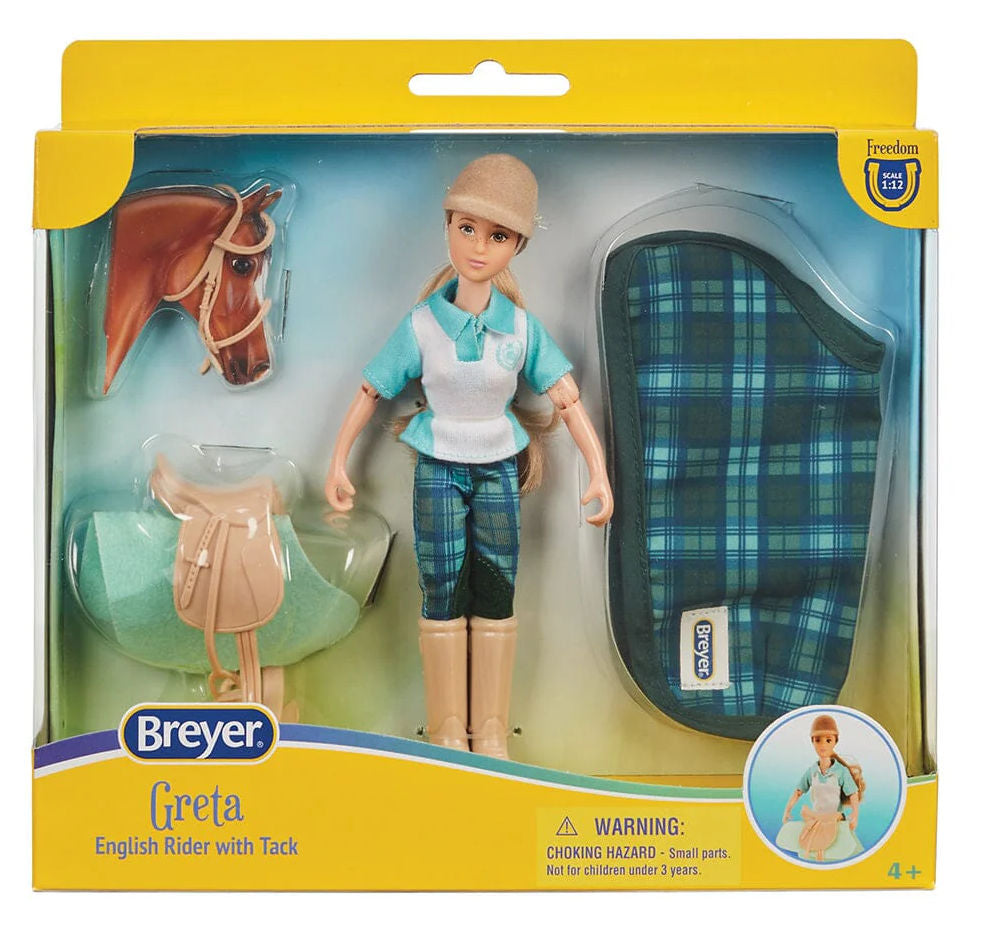 Stock #B-FS-10720 - Includes 6" articulated rider figure with outfit, English tack set with saddle, bridle and saddle pad, and one horse blanket. Pairs with all Freedom Series models, sold separately. Made by Breyer, for ages 4 & up.