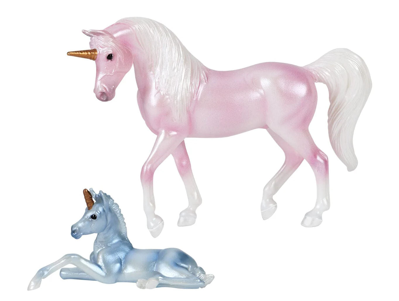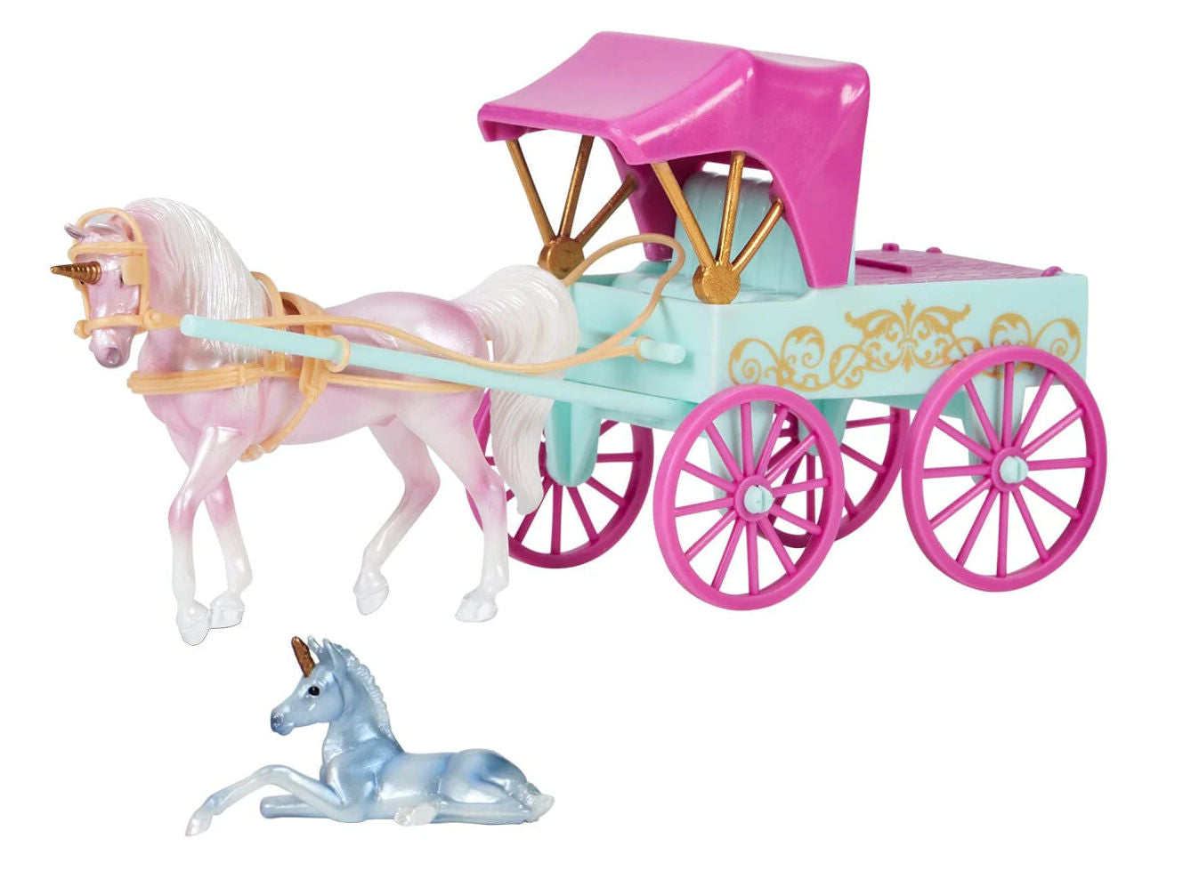 Stock #B-SM-10666 - set includes pink unicorn mare, silvery blue foal, harness & bridle and rolling carriage with canopy. Stablemates series, all plastic, made by Breyer, 6¾" L x 3¼" H, for ages 4 & up.