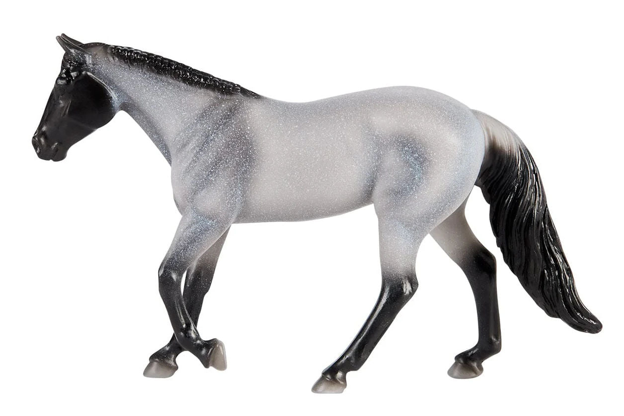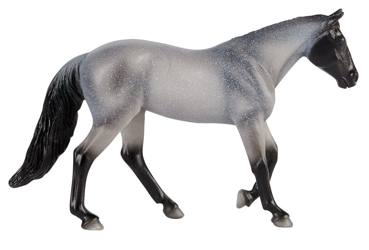 Stock #B-SM-10910 - The American Quarter Horse is the most popular breed in America, and for good reason - they're hardy, reliable, and versatile. Quarter Horses are named for their ability to sprint at high speeds over a quarter mile. The recognized colors of American Quarter Horses, include sorrel (chestnut), bay, black, brown, buckskin, chestnut, dun, grey, grullo, palomino, roan, perlino, and cremello. White markings can be found on their faces and legs, but large white pinto spots are prohibited. Stablemates Series 3, made by Breyer, 4¼" L x 2½" H, for ages 4 & up.