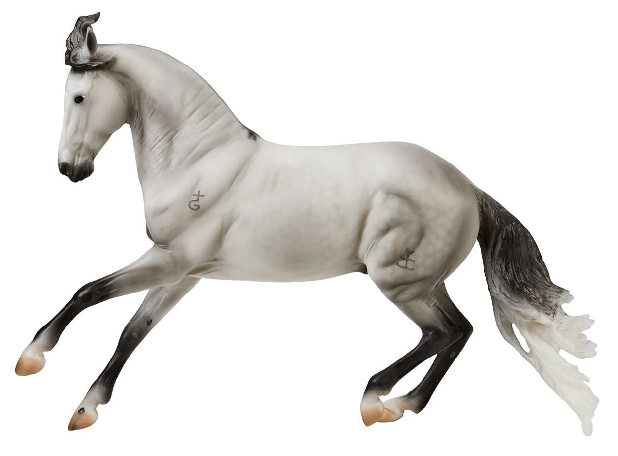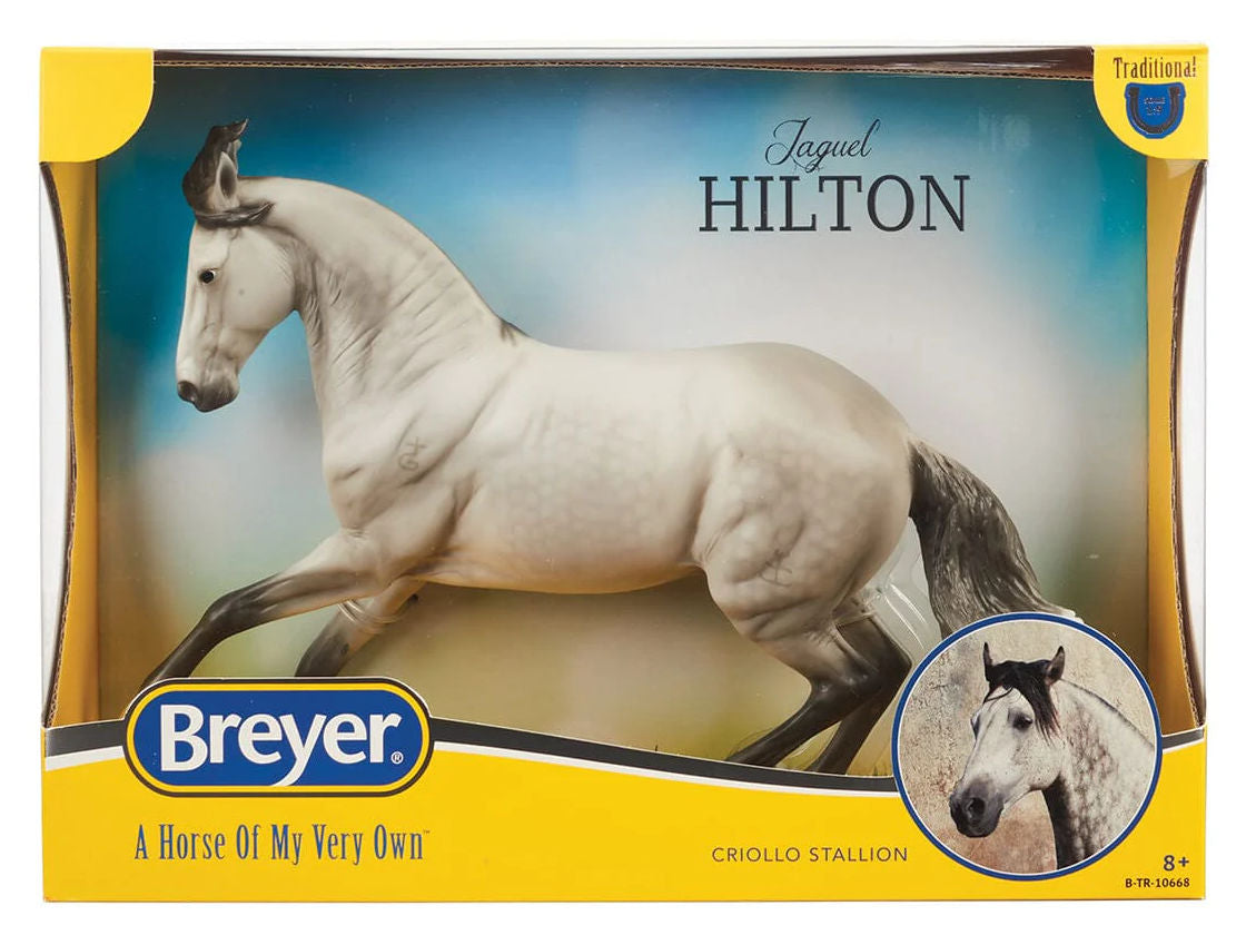 Stock #B-TR-10668 - Hailing from the Pampas region of South America, the Criollo is an athletic stock horses descended from the mounts of Spanish conquistadors. Hardy and reliable, they became the horse of choice for South American gauchos – the skilled horsemen of the region. Born in 2007 and imported from Uruguay, Jaguel Hilton is currently the only Criollo stallion standing at stud in the United States. His achievements include two qualifications for the prestigious Freno de Oro/Freio de Ouro world finals, the breed’s most famous ranch horse versatility competition. He is now retired from competition. 1/9 Traditional size, made by Breyer, 12" Lx 8" H, for ages 8 & up.