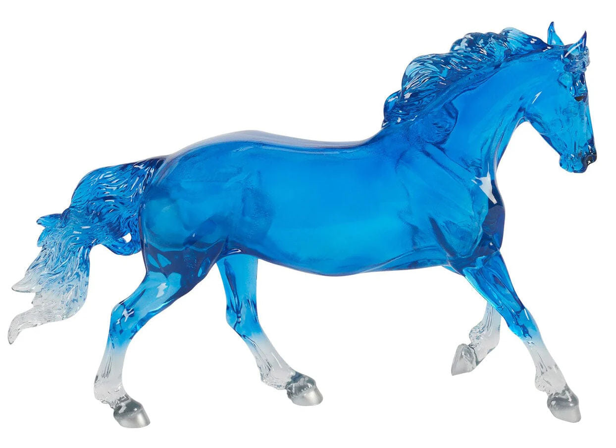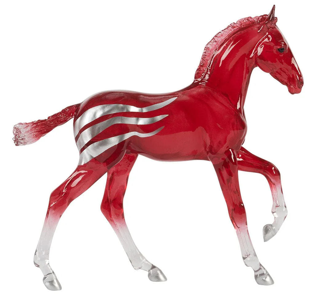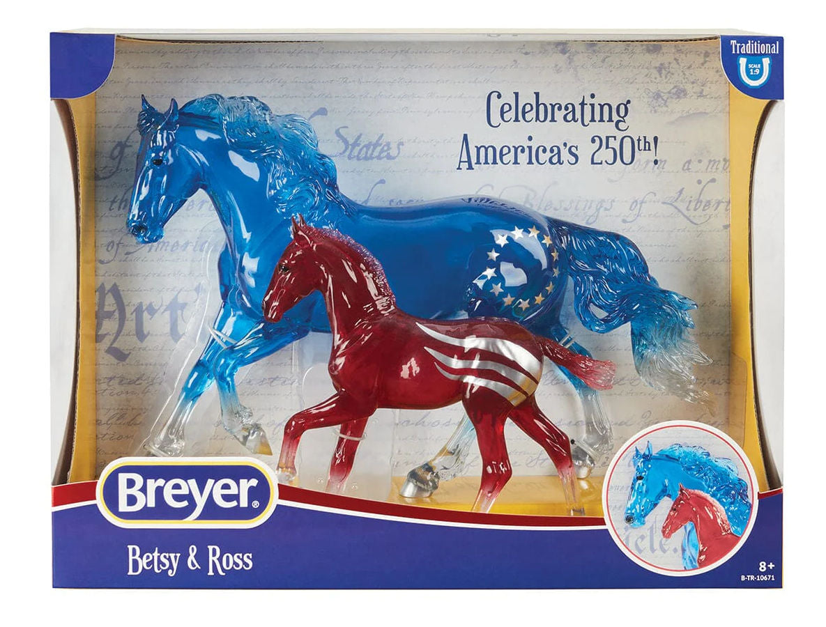 Stock #B-TR-10671 - Created in honor of America’s Semiquincentennial, Betsy & Ross are a special edition Mustang mare and foal that celebrate 250 years of American history. Inspired by the legendary Betsy Ross, the upholsterer credited with sewing the first American flag. Molded in translucent clearware, Betsy and her foal, Ross, gallop with determination and shine with vibrant patriotic colors. 1/9 Traditional size, made by Breyer, mare is 11½" L x 8¼" H, foal is 6½" L x 6½" H, for ages 8 & up.