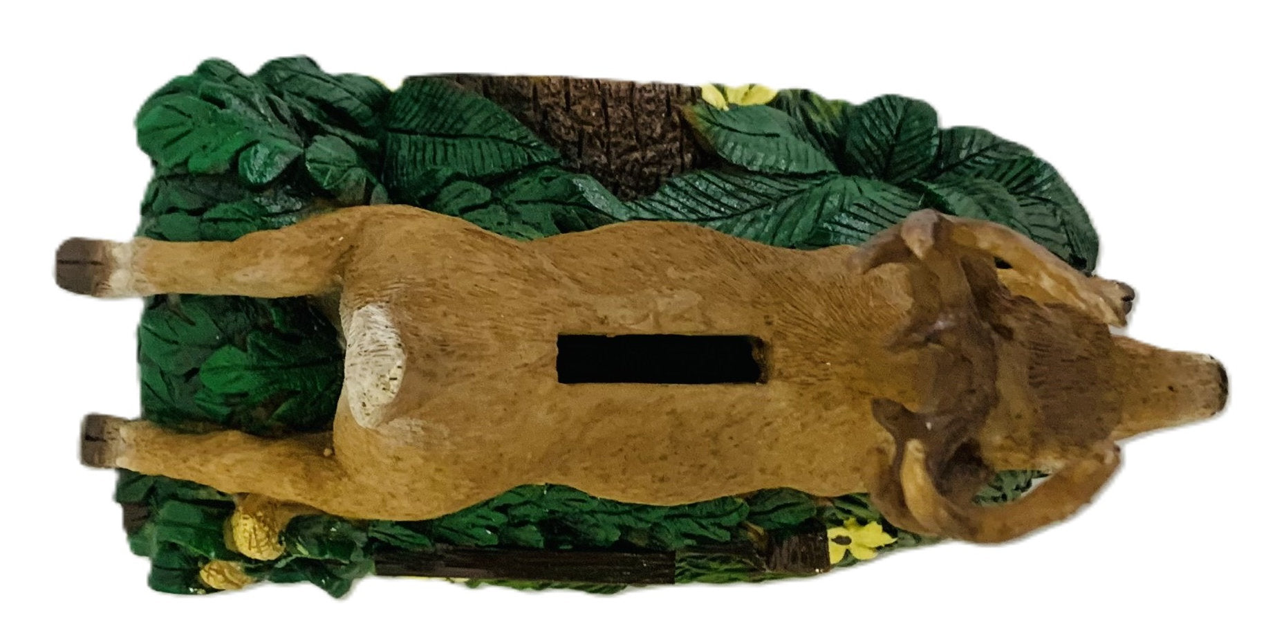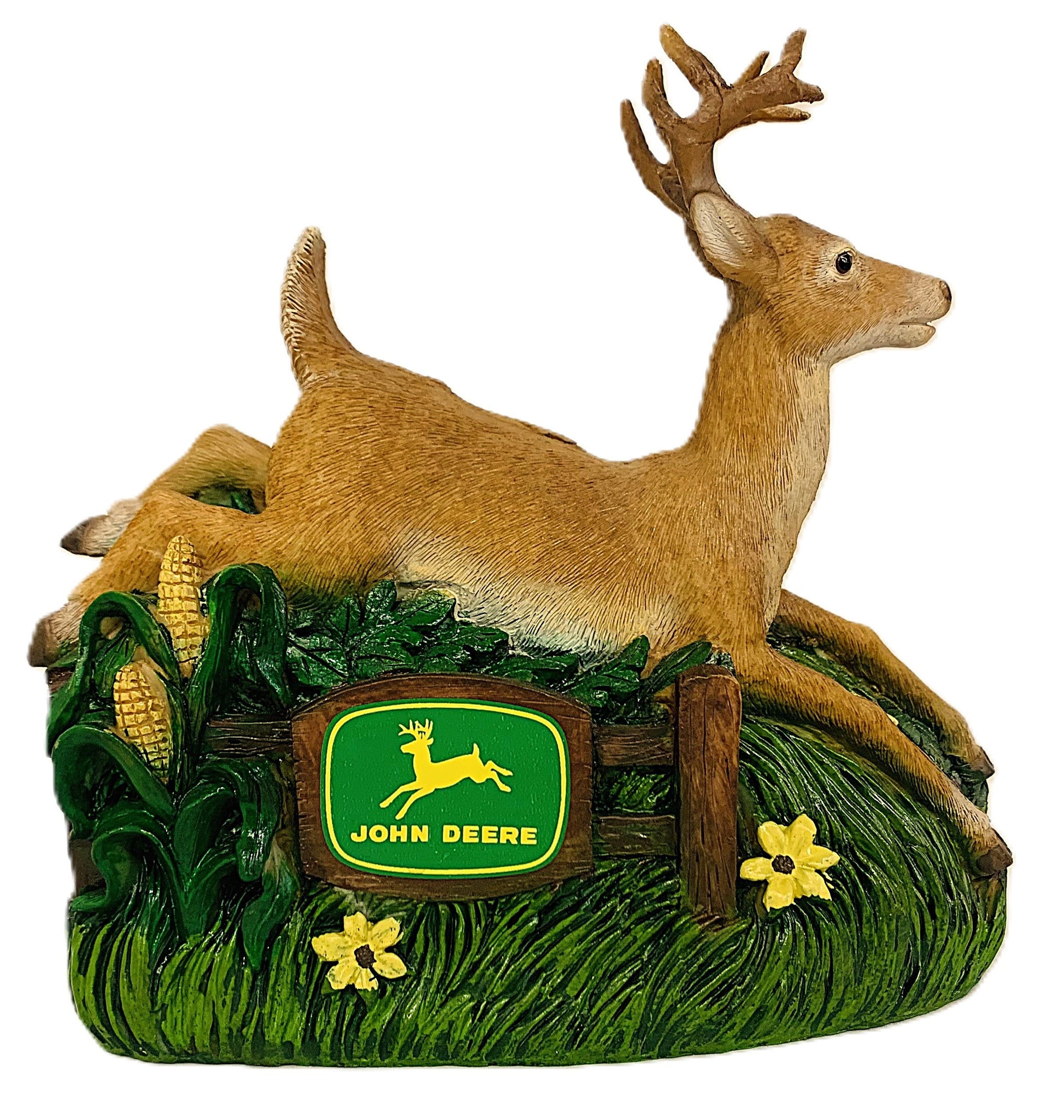 Stock #6983 - Mimicking the leaping deer from the John Deere logo, features a different style John Deere logo on each side. Made of durable polyresin with easy opening bottom, 6½" L x 6¼" H x 3½" W.