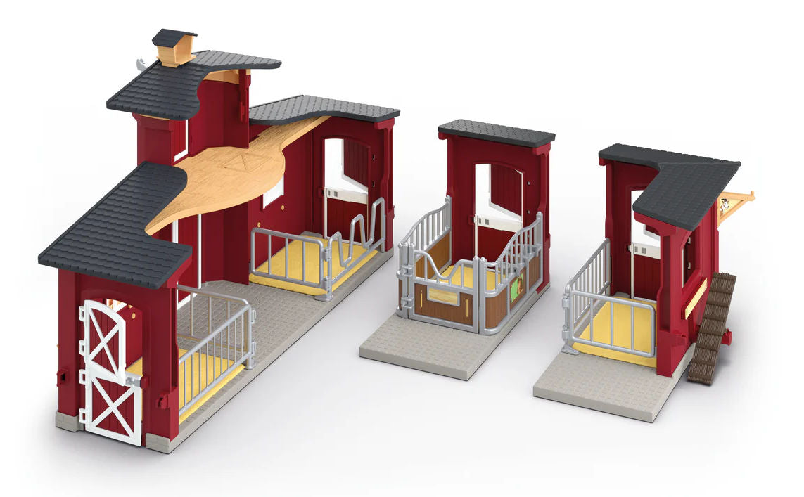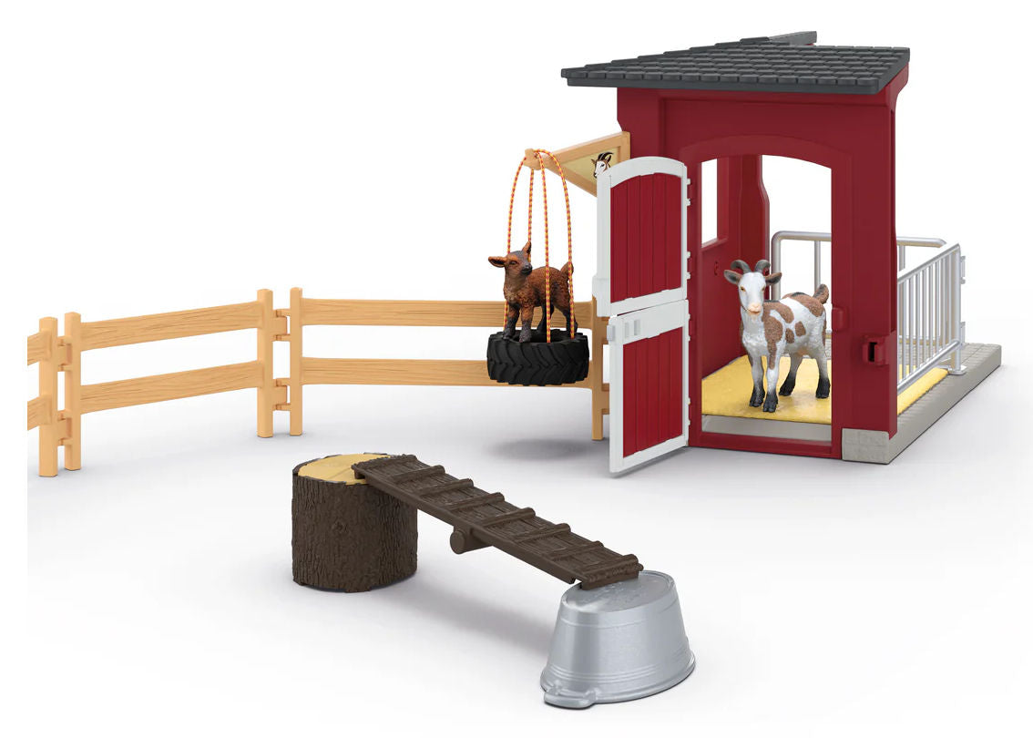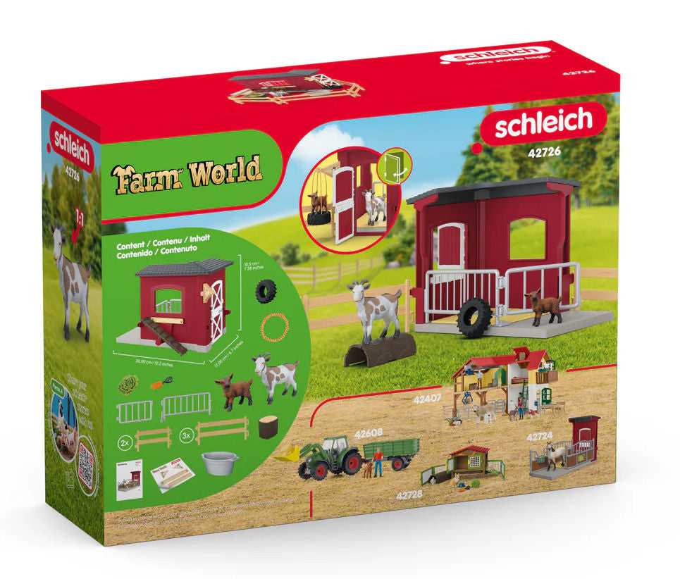 Stock #42726 - The goat and her little goat kid are very comfortable in the pretty, red goat stable. The kid can play on the tire or seesaw while his mother is snacking on fresh vegetables. The stable features an opening front barn door and includes 5 brown fence sections and 2 silver fence sections. Other accessories include goat, kid goat, tub, log, assorted vegetables, sticker sheet and set-up instruction. The stable can be attached to the large farm (42606), large stable (42605) and pony boxes (42724 + 42609) all sold separately. All plastic, made by Schleich, 7" L x 7" H x 5" W, for ages 3 & up.