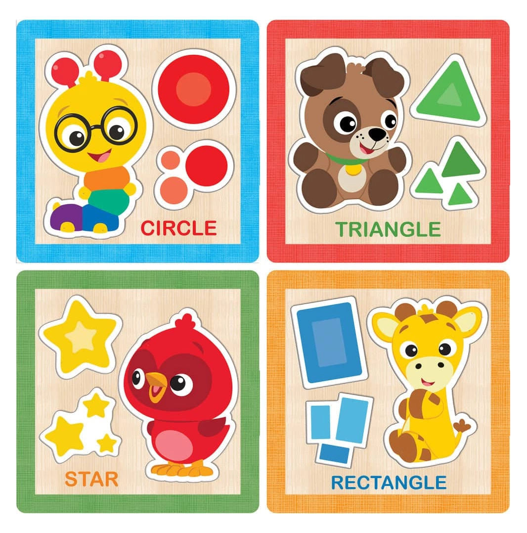 Stock #12648 - set includes 4 colorful wooden animal and shape puzzles with only 3 pieces each. Made by Masterpieces Puzzles, 5¾" W x 5¾" H, for ages 1 & up.