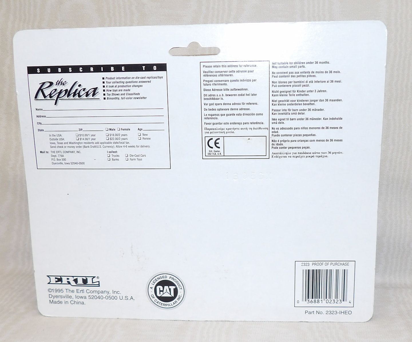 Stock #2323EO - die-cast metal frame with movable rubber tracks, removable plastic grain cart with movable auger. Grain cart slides back and then lifts up to remove. In new condition, the bubble packaging has been cut open on the top and side. Made in 1995 by Ertl, 4" L x 2" H x 1¾" W, for ages 3 & up. Vintage, older out of production toy. Opened packaging, AS IS.