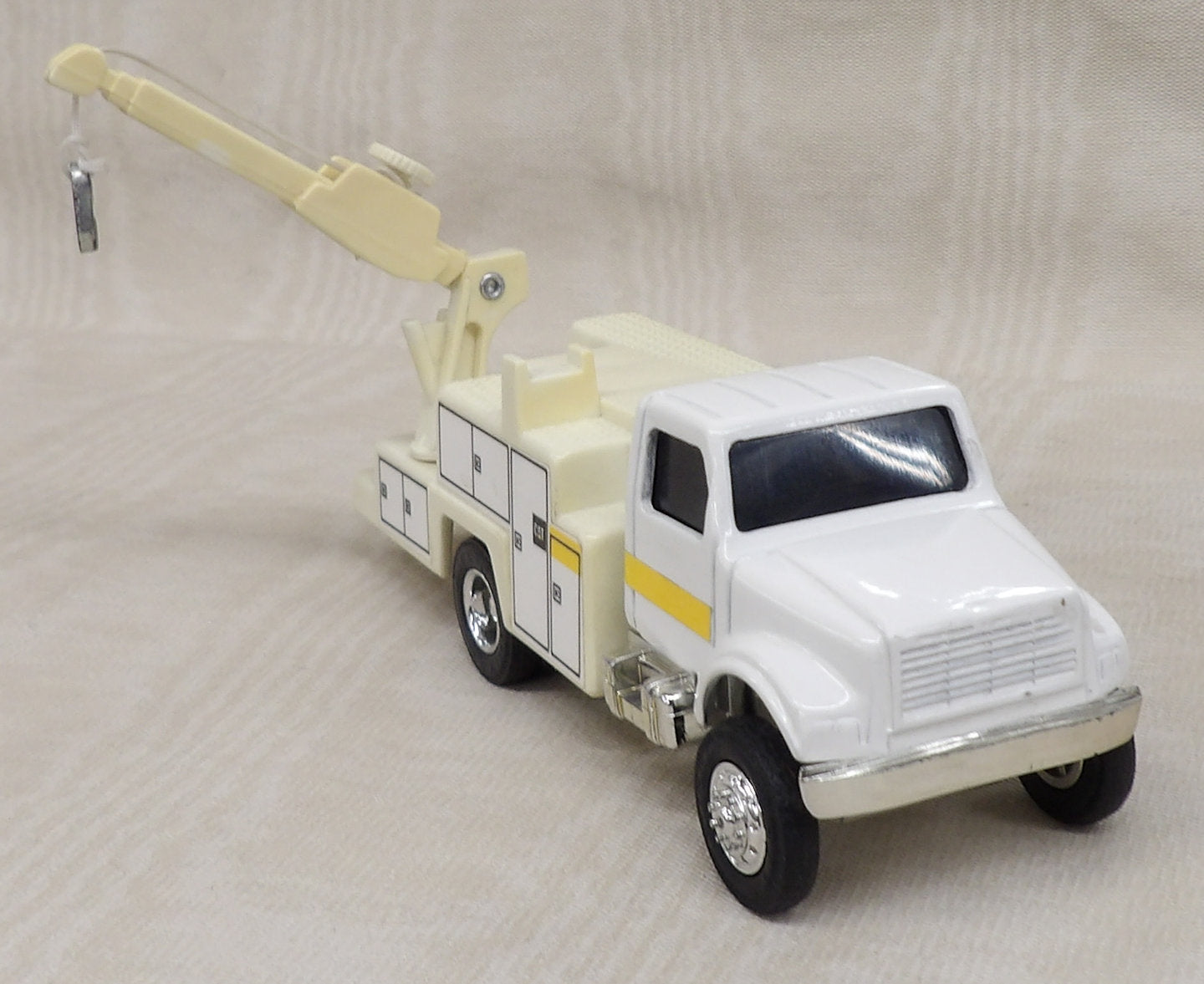 Stock #2411 - die-cast cab and chassis with rubber tires, plastic service box. Plastic service grain pivots 360°, raises and lowers, working winch line. In very good condition, plastic has yellowed from age. Made in 1991 by Ertl, 4½" L x 2" H x 1½" W, for ages 3 & up. Vintage, older out of production toy. No box, AS IS.