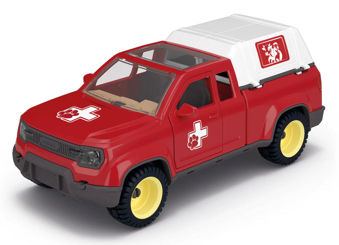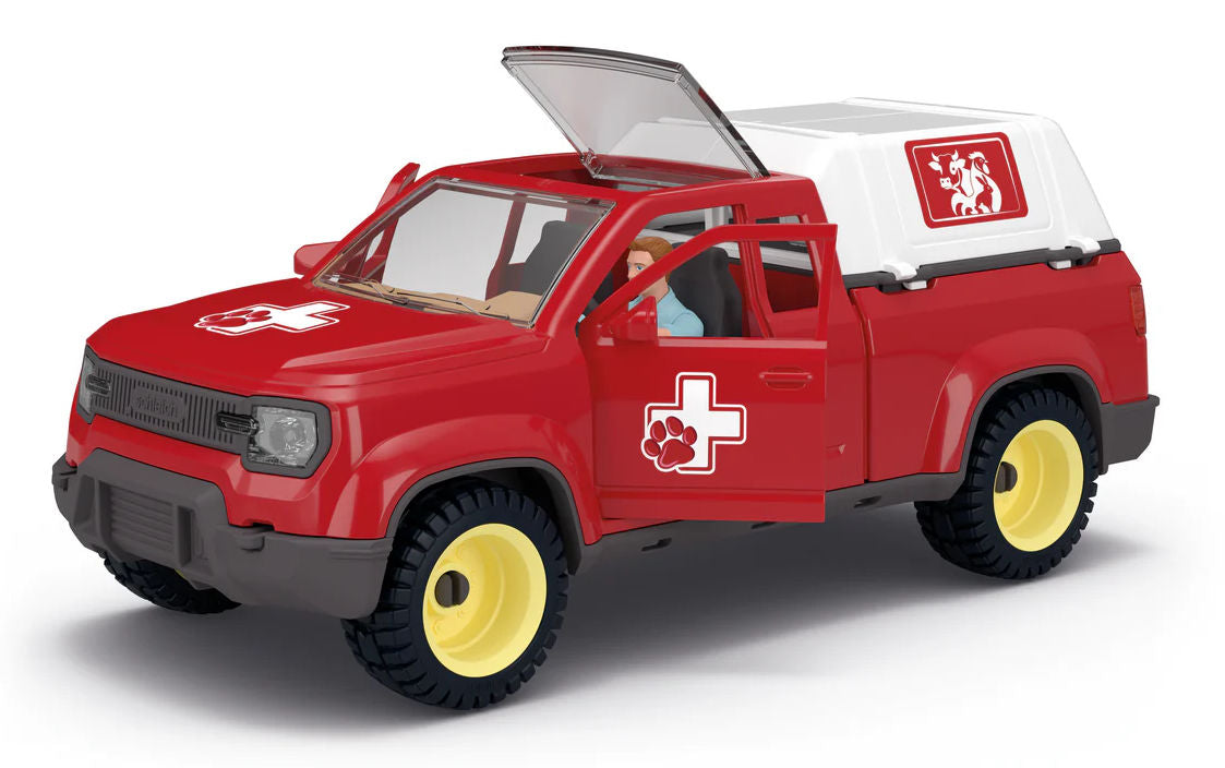 Stock #42727 - The little calf is injured! Farmer Paul goes to help with his vet pickup. The pickup has opening doors, tailgate, sunroof and topper that folds open to reveal medical supplies. Accessories include poseable Farmer Paul figure (3¾" H), Texas Longhorn calf, bottle, stethoscope, bandage, sticker sheet and assembly instructions. All plastic with rubber tires, made by Schleich, 10¾" L x 5" H x 4½" W, for ages 5 & up.