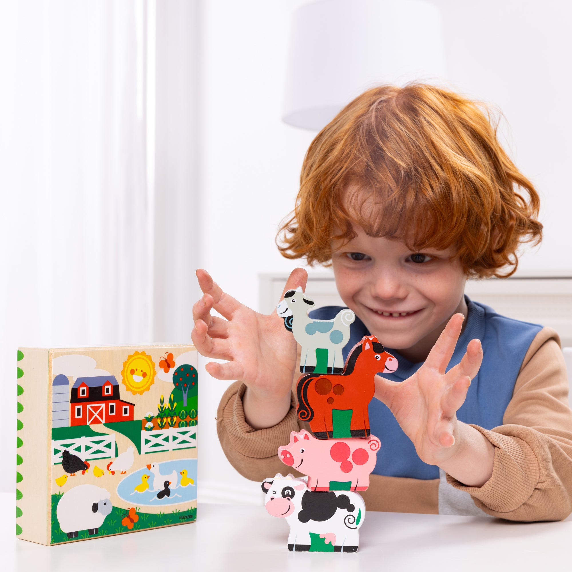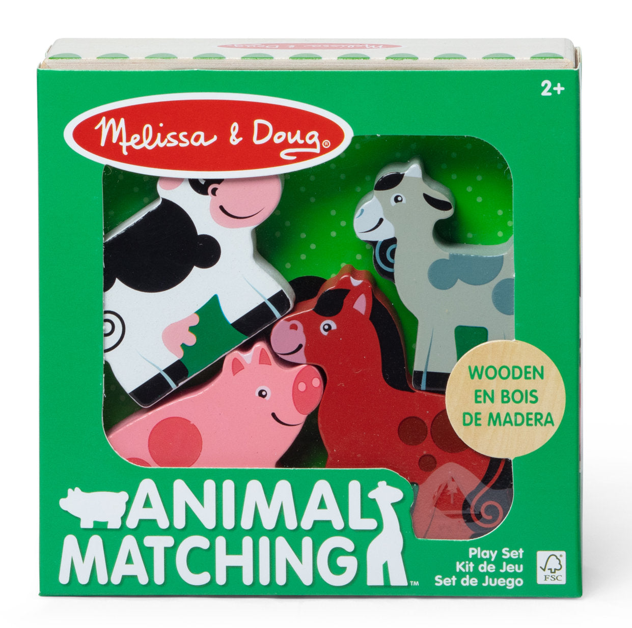 Stock #50273 - Match, stack, and play with four adorable wooden chunky farm animal play pieces! Set includes a double-sided horse, cow, goat and pig. Match the pieces to outlines in a sturdy wooden crate, which also has full-color art on the back – stand it up for a pretend play backdrop! Pieces stow neatly in the crate for easy clean up. Made by Melissa & Doug, for ages 2 & up. Crate is 5¼" L x 5¼" W x 1½" H.