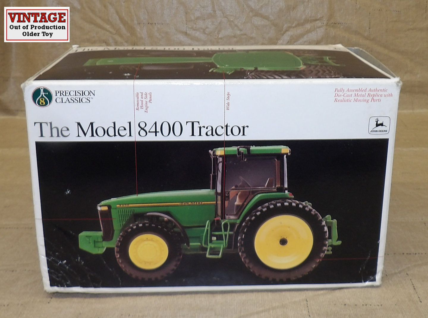 Stock #5259CO - 8th in the John Deere Precision Classics series of high detail tractors. Die-cast metal with rubber tires, metal rims, steerable front wheels, removable metal front weights, movable 3-point hitch. Includes instructions for mounting mirrors. Tractor has been displayed out of the box, in very good condition. Box has some slight wear on the sides and both end flaps are worn & torn. Made in 1995 by Ertl, with the box, 7" L x 4" H x 3¾" W, for ages 14 & up. Not recommended for child's play. Item is out of a private collection. Vintage, older out of production toy. AS IS.