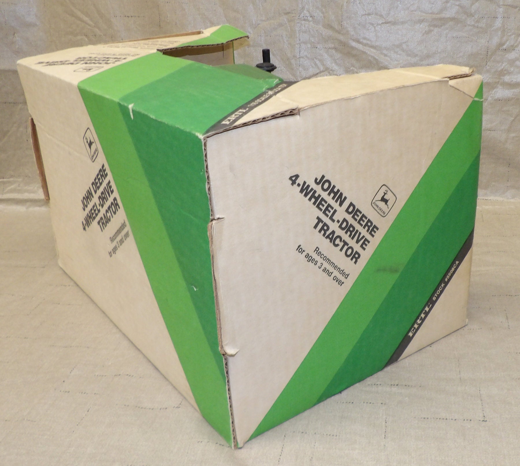 Stock #5508CA - " Collector's Series July 1982" cast into back of tractor, die-cast metal with rubber tires, plastic rims, metal cab, no cab windows, articulated steering. Tractor has been displayed out of the box and is in very good condition with a small paint chip on the right top of the hood and right step. Box has some discoloration and wear on the sides and flaps. Made in the U.S.A. in 1982 by Ertl, 13½" L x 8¼" H x 8" W, for ages 14 & up. Item is out of a private collection. Vintage, older out of production toy. AS IS.