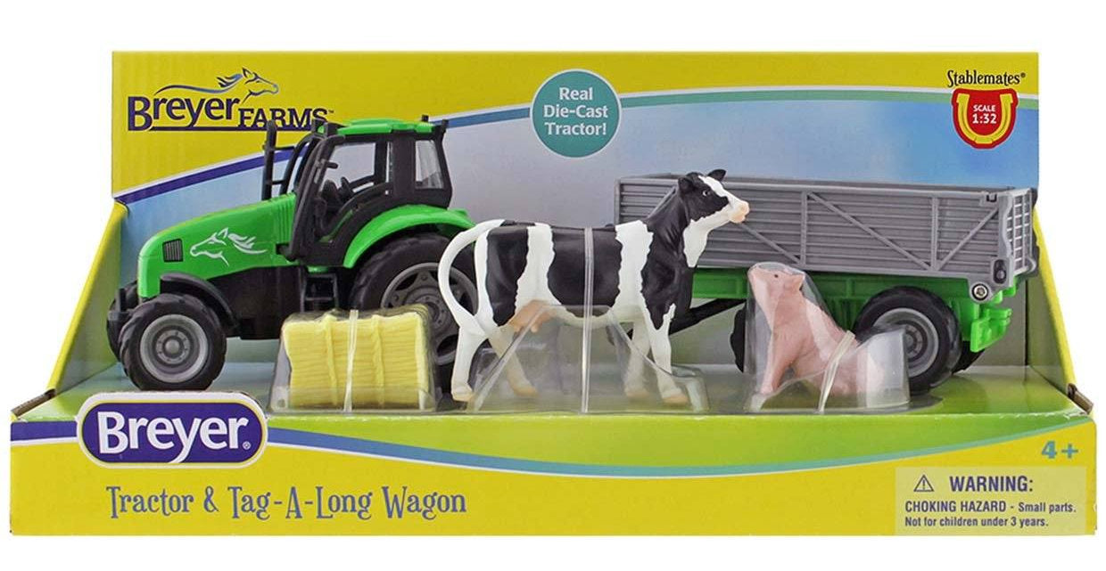 Stock #59238 - tractor has rolling wheels and hooks up to pull the tag-a-long wagon with ease. Need to empty the wagon? Just push the lever to lift the wagon bed up for easy dumping! Comes complete with a cow, pig, and hay bale. All plastic, made by Breyer, 10" L x 3½" H x 2½ W, for ages 4 & up