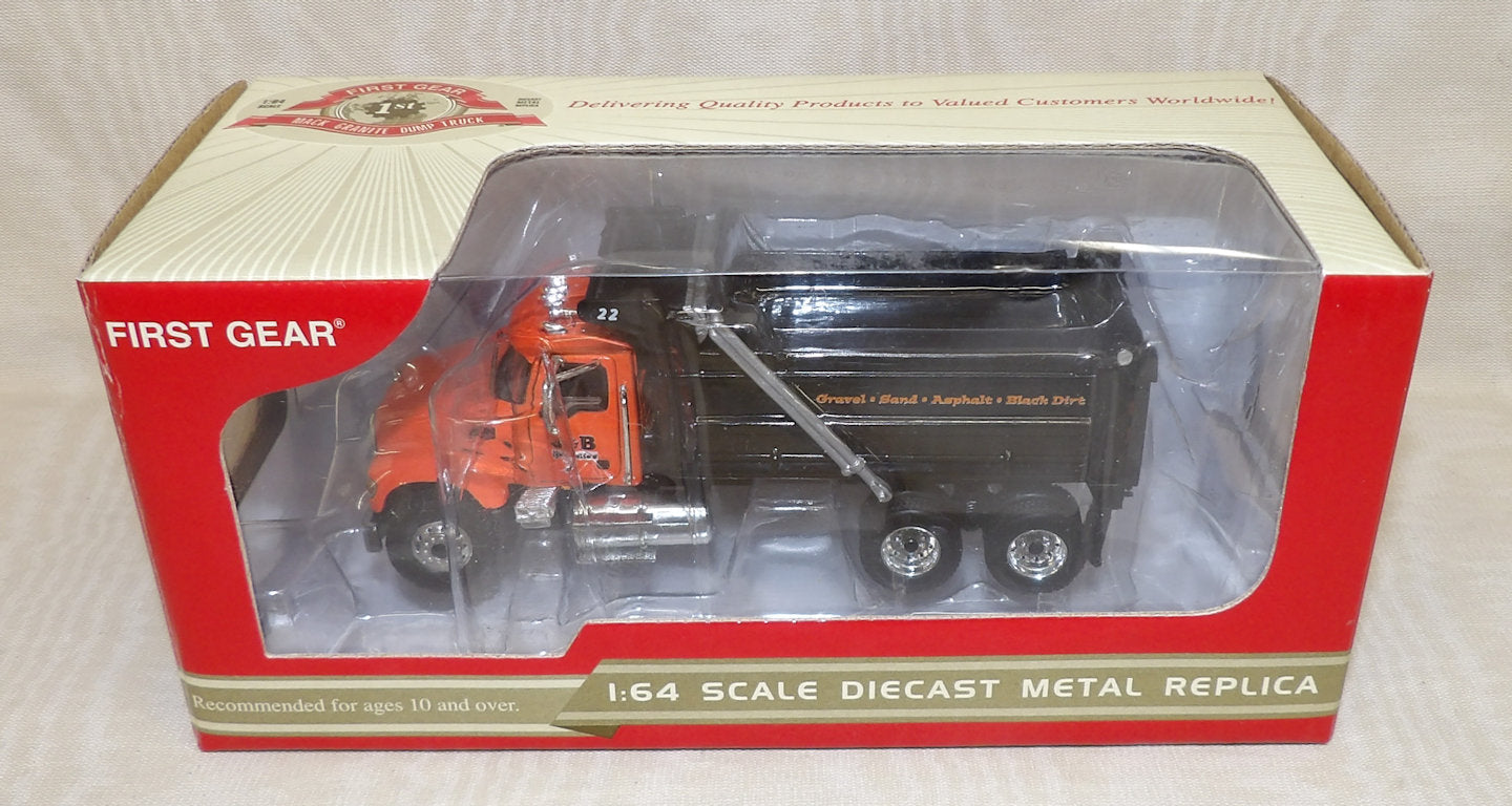 Stock #69-0021 - die-cast metal with rubber tires, opening hood, steerable front wheels, dump box tips with opening end gate. Cylinder that holds dump box up is broken and missing bottom piece. Box is in very good condition. Made in 2005 by First Gear, 4¾" L x 2" H x 1 5/8" W, for ages 14 & up. Item is out of a private collection. Vintage, older out of production item. Broken/missing hoist cylinder. AS IS.