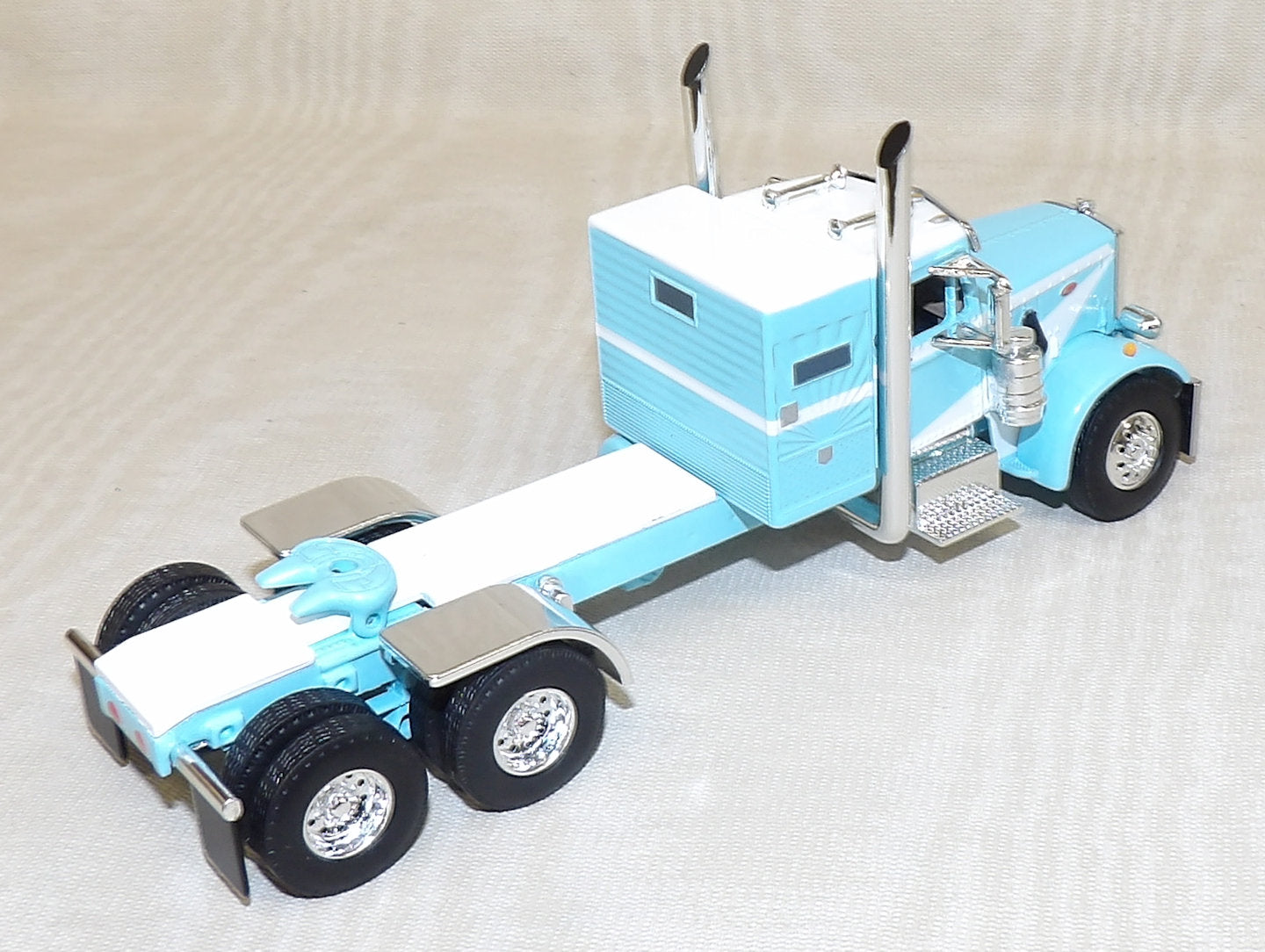 Stock #60-1816 - Light blue with white striping, die-cast metal cab with rubber tires, hood does NOT OPEN, steerable front wheels. Trailer is die-cast metal with rubber tires, opening rear door which is centered on back of trailer and adjustable trailer stands. Made by DCP by First Gear, 12" L x 2½" H x 1 5/8" W, for ages 14 & up. Not designed or recommended for child's play.