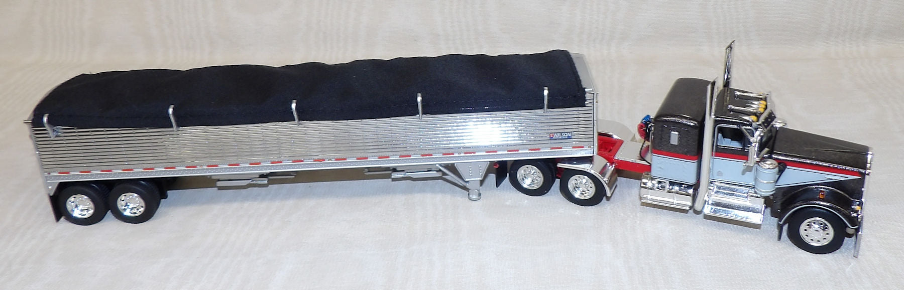 Stock #60-2137 - dark & light gray with red stripes, die-cast metal cab with rubber tires, opening hood with detailed engine, steerable front wheels. Trailer is die-cast metal with rubber tires, black cloth roll-up tarp, opening hopper doors and adjustable trailer stands. Made by DCP by First Gear, 12" L x 2" H x 1 5/8" W, for ages 14 & up. Not designed or recommended for child's play.