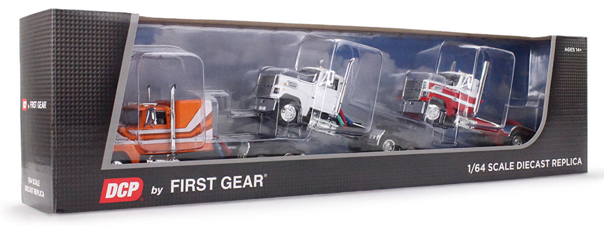 Stock #60-2175 - includes white LTL 9000 Day Cab, red & white LTL 9000 Day Cab and orange & white LTL 9000 60" Flat Top Sleeper Cab. All are die-cast metal with rubber tires, opening hood and steerable front wheels.  Made by DCP by First Gear, day cabs are 4¾" L x 1¾" H x 1½" W, cab with sleeper is 5" L x 2" H x 1½" W, for ages 14 & up. Not designed or recommended for child's play.