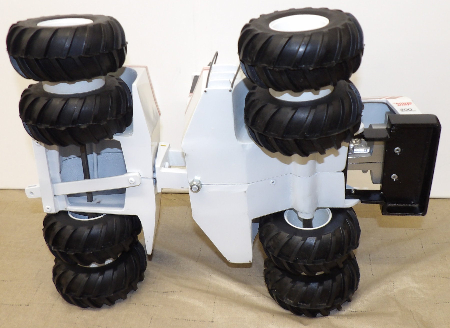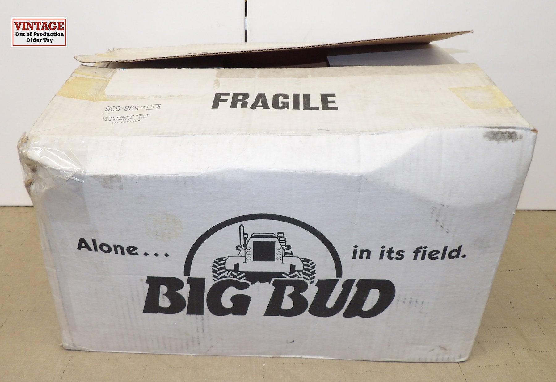 Stock #CB1402 - All cast metal with rubber tires, plastic rims, articulated steering, no cab windows, cab tilts back, pivoting hitch. Tractor is in very good condition with some paint chips on the left fender from original paint imperfections. With original box, box has some wear and crushed corners. Custom built in 1994 by Martin Fast (Mini Big Bud.), 17" L x 9½" H x 12" W, for ages 14 & up. Custom built, vintage older out of production toy. AS IS.