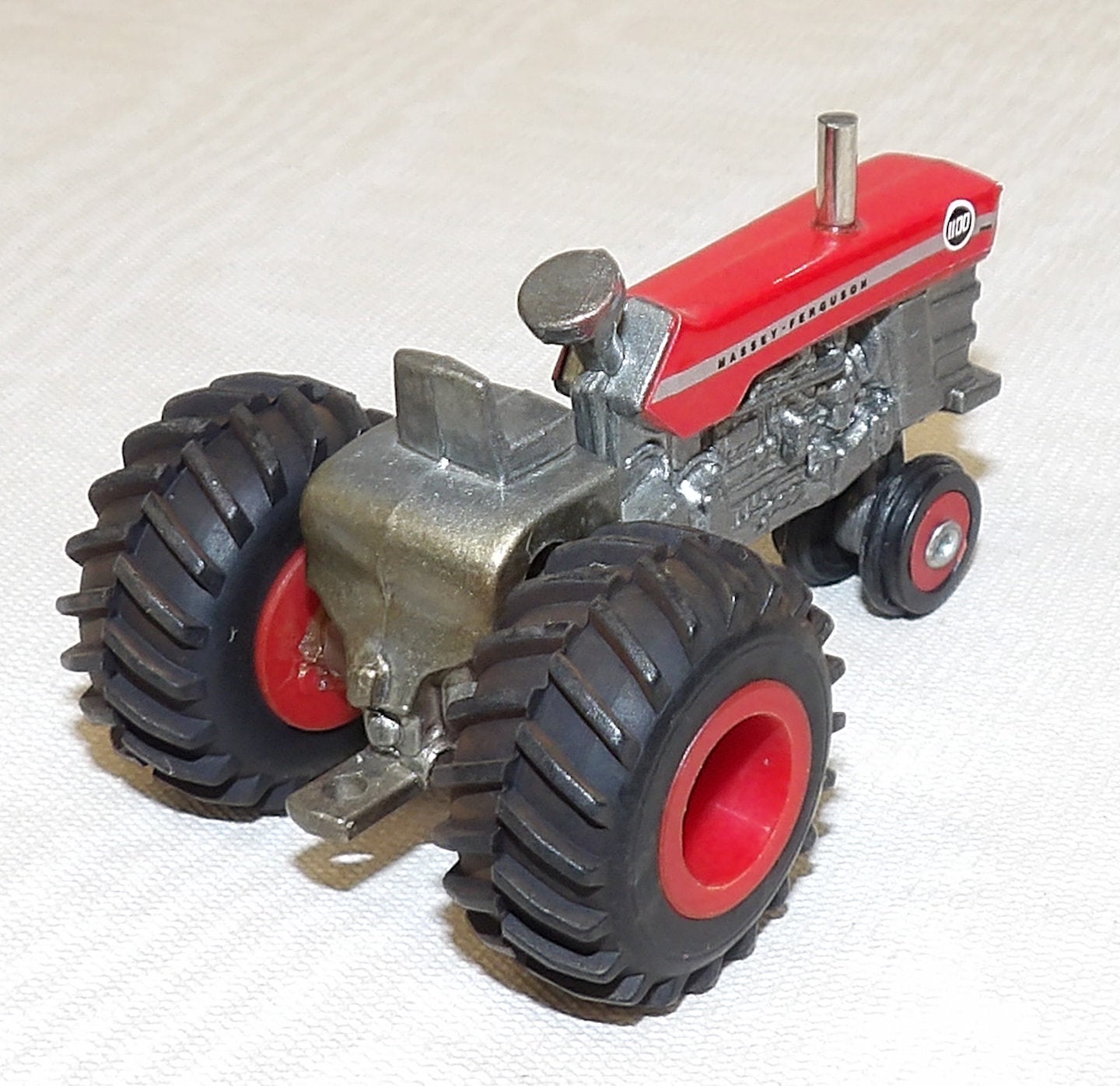 Stock #CB1579 - die-cast metal tractor made by Scale Models with plastic front tires. Has been customized with wide rear rubber tires with plastic rims, plus a chrome muffler has been added. Tractor made in the late 1990s, 2¼" L x 1¼" H x 1½" W, for ages 8 & up. Vintage, older out of production toy. No package, AS IS.