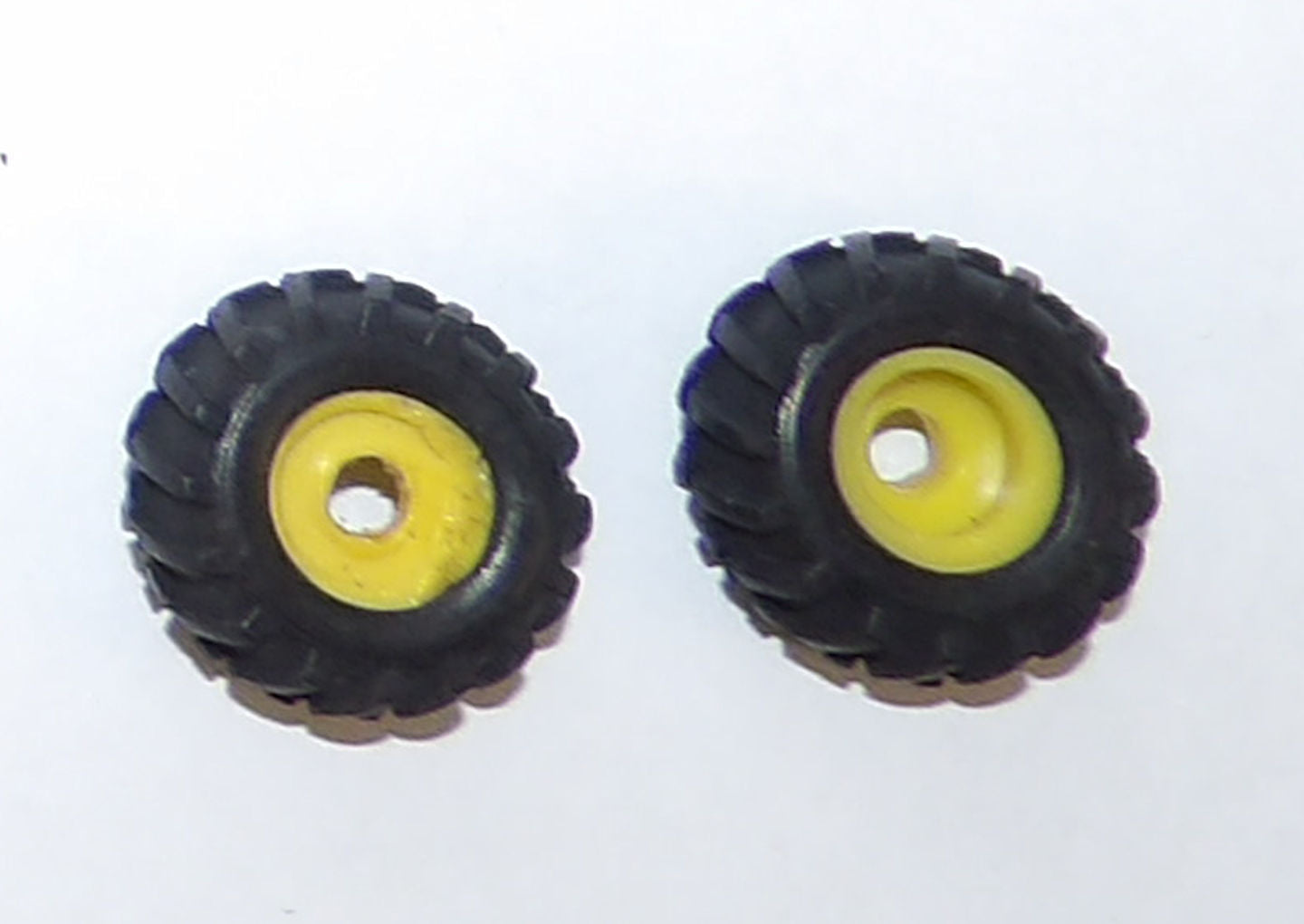 Stock #SY201 - 1 pair rubber tires with plastic rims, 5/8" round x 1/4" wide, 1/8" axle hole.