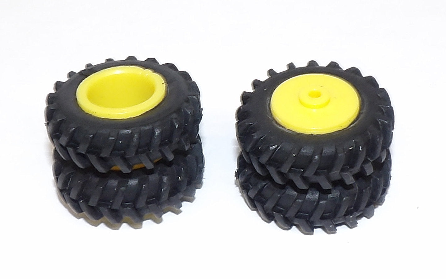 Stock #SY210 - pair includes 4 rubber tires, 1 3/16" high x 5/8" wide, and 2 plastic dual rims, 15/16" wide x 11/16" high, 1/8" axle hole.
